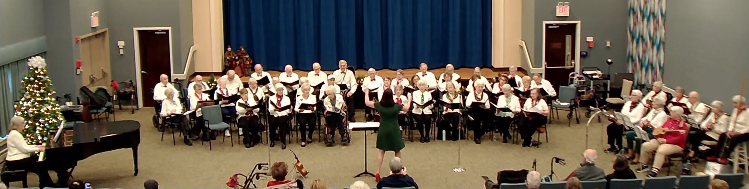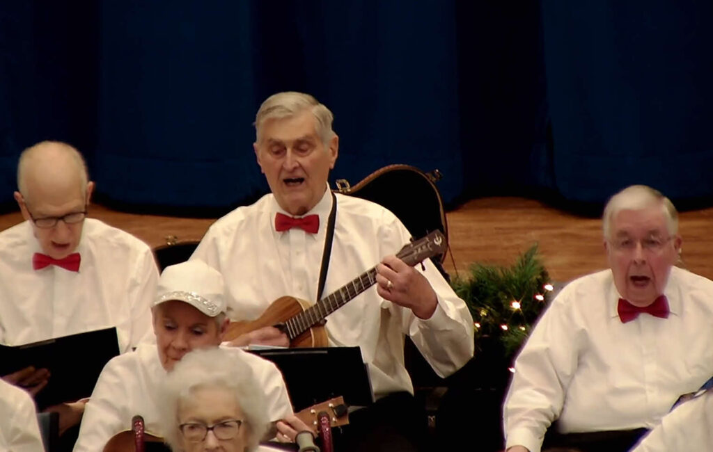 On Thursday, December 19, The Medford Leas Singers presented their Winter Concert, joined by The Cool Hand Ukes. Danielle Peterson Boyd directs the singers, and Conant Atwood directs the Ukes (as well as singing with the singers). There are several singers who also play the ukuleles on a regular basis. Marlea Gruver was the accompanist.
